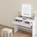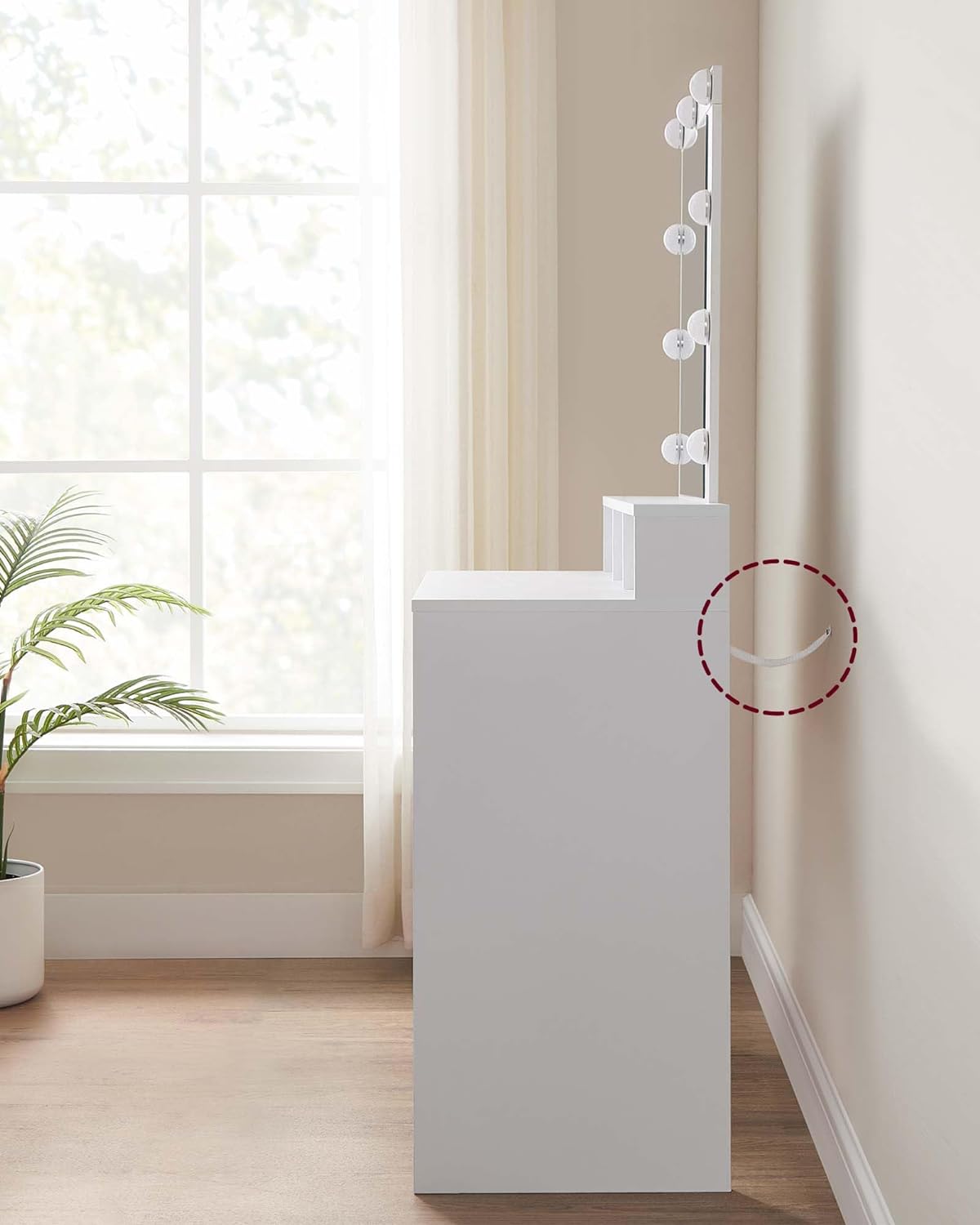 The side walls are reinforced with a back plate, creating a stable structure that prevents the vanity from wobbly with every movement you make or when something is placed on it. There's also plenty of space on the left and right to store all your cosmetic products. The lighting can be adjusted to your desired brightness, allowing you to always make well-informed decisions about your makeup.
